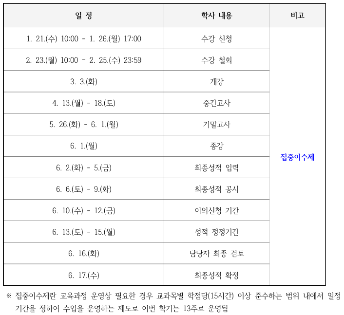 2026학년도 1학기 교과목 수강신청 및 주요 학사 일정을 아래와 같이 안내드리오니 학생 여러분의 많은 관심과 참여 바랍니다.